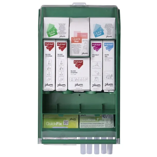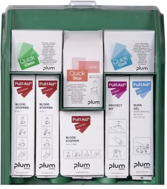 Apteczka PLUM Pull1Aid (nr 5183) przeznaczona jest do montażu na ścianie jako uniwersalna apteczka pierwszej pomocy w każdym miejscu pracy. Ważna jest natychmiastowa reakcja w pierwszych sekundach po wypadku, dlatego też stacja powinna być umiejscowiona możliwie blisko miejsca potencjalnego zagrożenia. Zawiera zarówno środki do udzielenia pierwszej pomocy jak i do pielęgnacji ran.